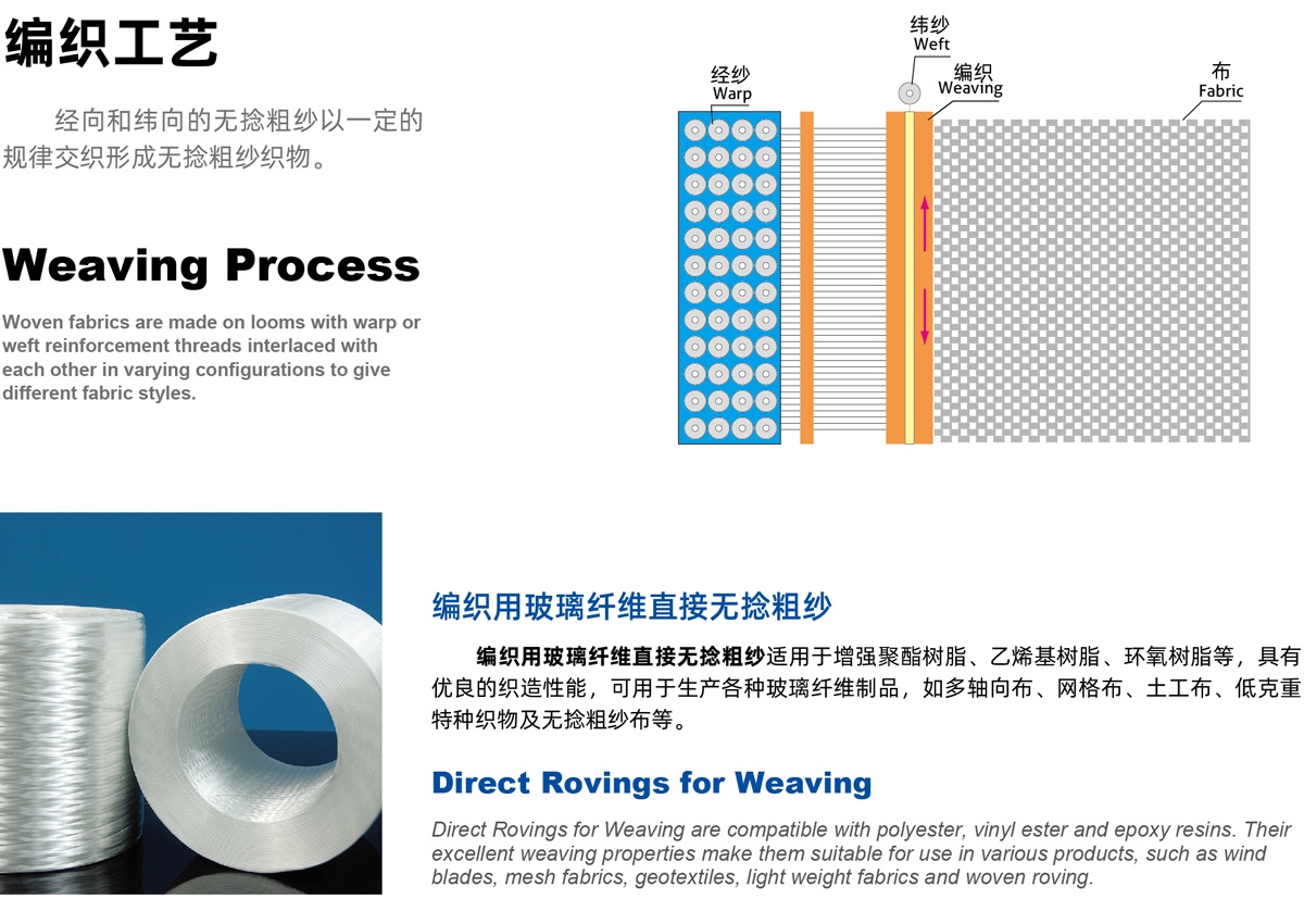 | 386H | 毛羽少,與樹脂相容性好,制品機械性能高 Low fuzz, good compatibility with resin, and high mechanical properties | 用于無捻粗紗布織造,制造管道、游艇等 Woven roving, used in pipes and boats | |