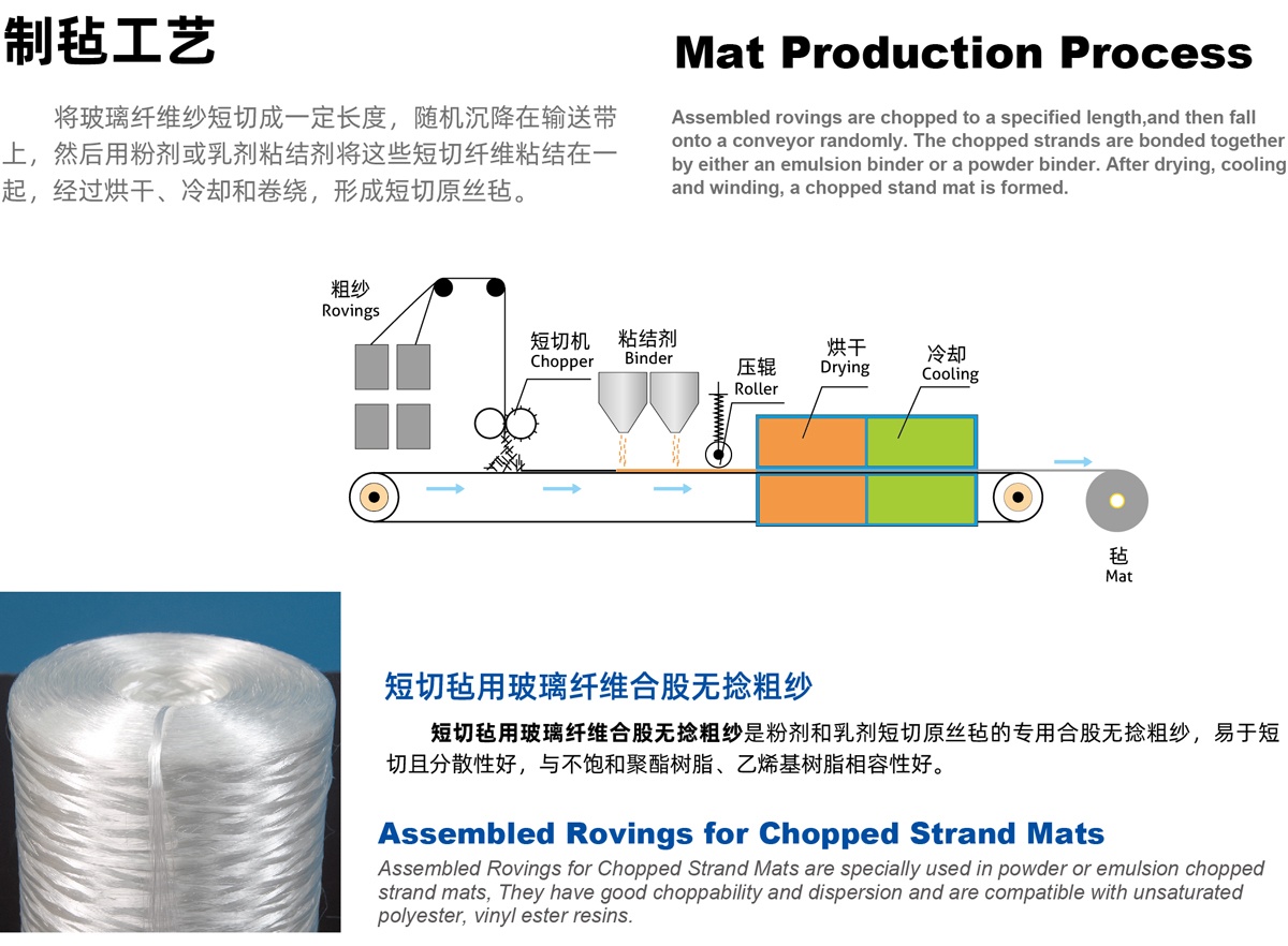 | 512 | 通用型制氈用紗,良好的短切分散和抗靜電性能,樹脂浸透速度快 General purpose roving, good dispersion after chopping, good static control and fast wet-out in resins | 常規(guī)短切氈 General chopped strand mats | |