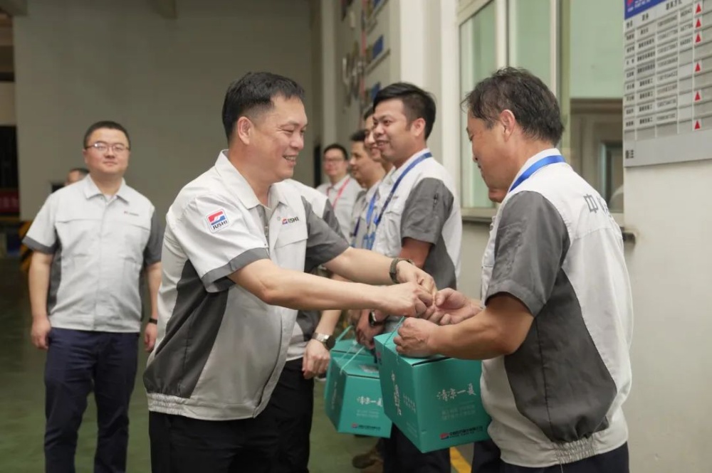 “大家辛苦了!感謝大家!”在五分廠和磊石公司,楊國(guó)明總裁如一位老友一般親切慰問(wèn)熱情堅(jiān)守生產(chǎn)一線的員工,向他們給予最衷心的感謝和親切的慰問(wèn),為他們一一送上清涼,叮囑他們要做好防暑降溫工作,共同對(duì)抗高溫,保障生產(chǎn)。他叮囑相關(guān)負(fù)責(zé)人要密切關(guān)注氣溫變化,認(rèn)真落實(shí)防暑降溫措施,備齊防暑藥品,切實(shí)保障員工健康權(quán)益。